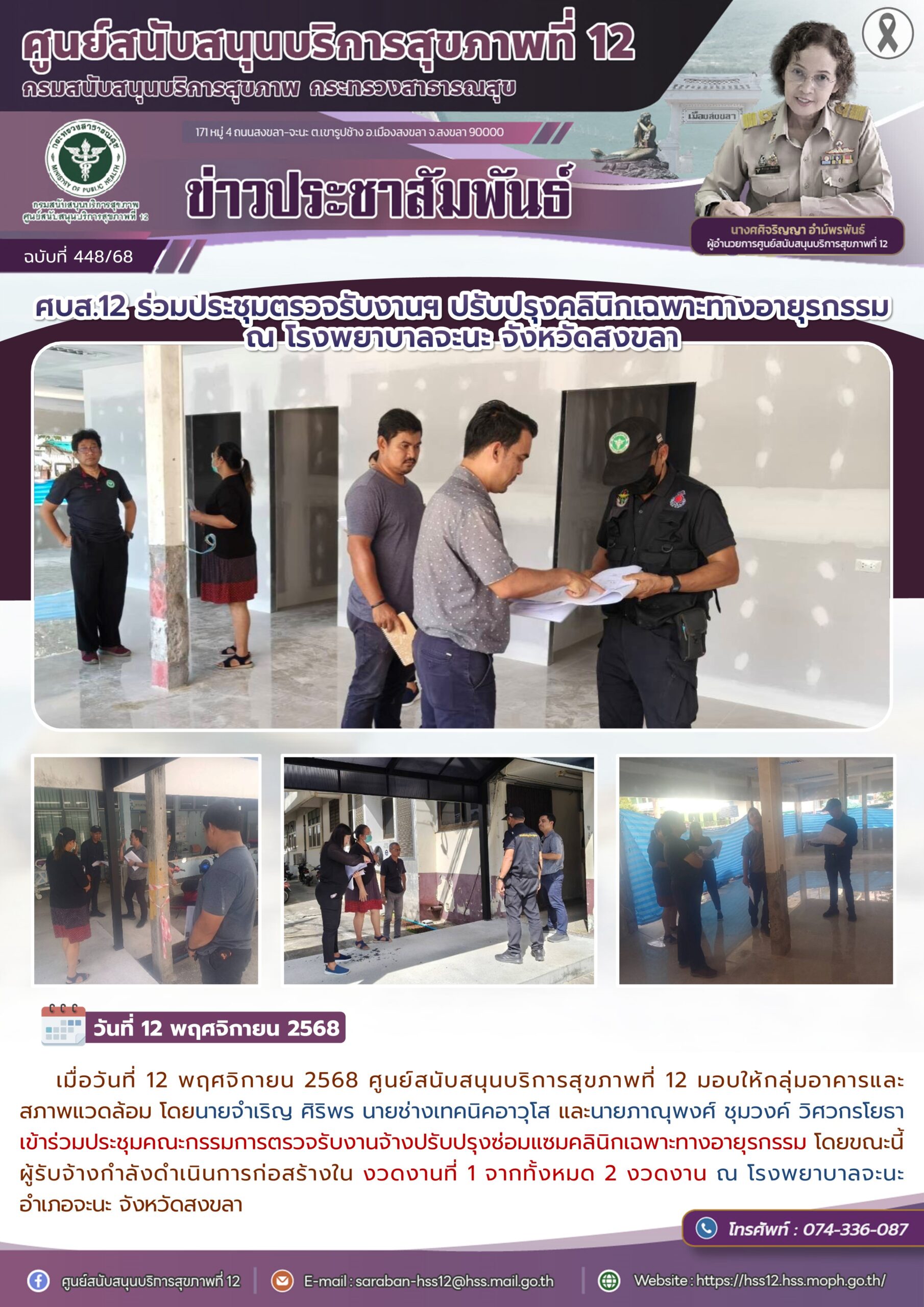เมื่อวันที่ 12 พฤศจิกายน 2568 ศูนย์สนับสนุนบริการสุขภาพที่ 12 มอบให้กลุ่มอาคารและสภาพแวดล้อม โดยนายจำเริญ ศิริพร นายช่างเทคนิคอาวุโส และนายภาณุพงศ์ ชุมวงค์ วิศวกรโยธา เข้าร่วมประชุมคณะกรรมการตรวจรับงานจ้างปรับปรุงซ่อมแซมคลินิกเฉพาะทางอายุรกรรม โดยขณะนี้ ผู้รับจ้างกำลังดำเนินการก่อสร้างใน งวดงานที่ 1 จากทั้งหมด 2 งวดงาน ณ โรงพยาบาลจะนะ อำเภอจะนะ จังหวัดสงขลา