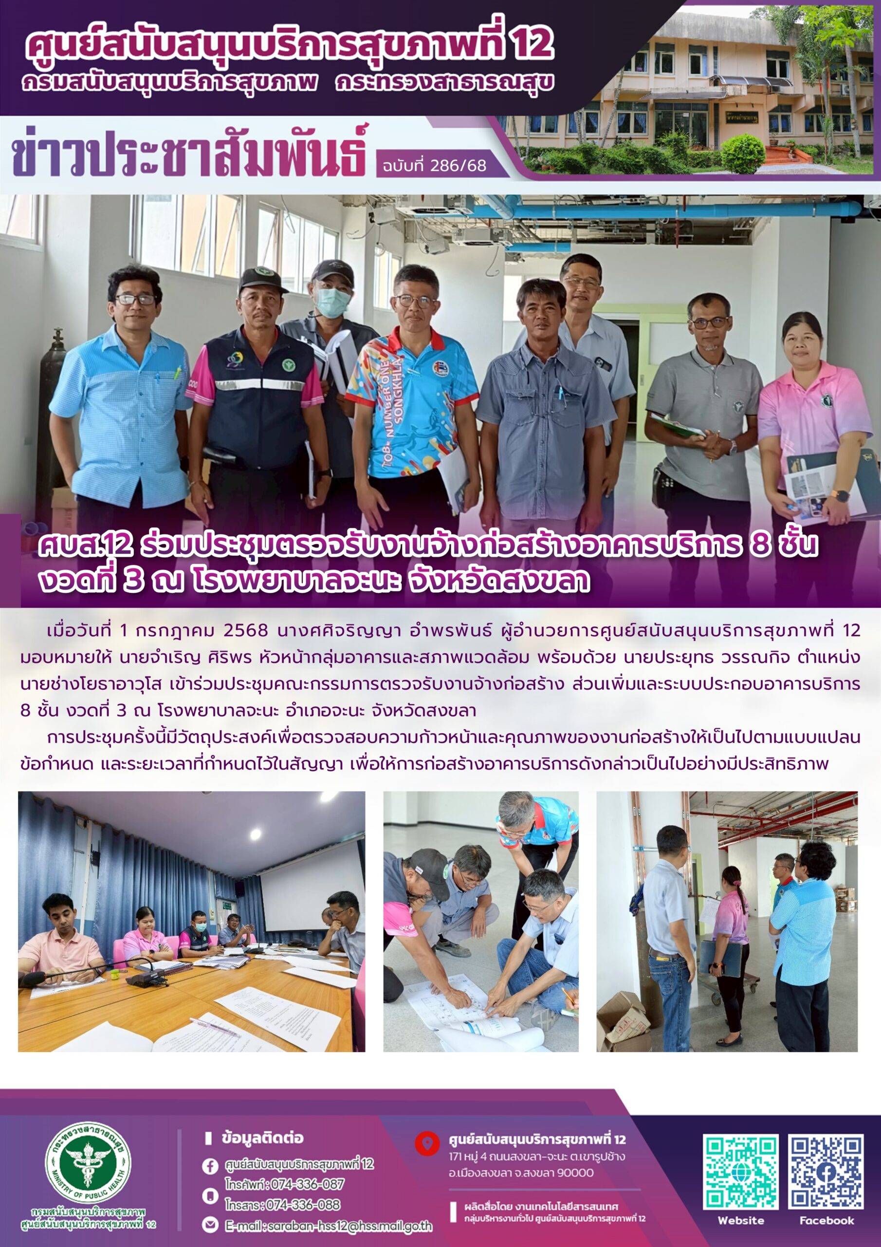 เมื่อวันที่ 1 กรกฎาคม 2568 นางศศิจริญญา อำพรพันธ์ ผู้อำนวยการศูนย์สนับสนุนบริการสุขภาพที่ 12 มอบหมายให้ นายจำเริญ ศิริพร หัวหน้ากลุ่มอาคารและสภาพแวดล้อม พร้อมด้วย นายประยุทธ วรรณกิจ ตำแหน่งนายช่างโยธาอาวุโส เข้าร่วมประชุมคณะกรรมการตรวจรับงานจ้างก่อสร้าง ส่วนเพิ่มและระบบประกอบอาคารบริการ 8 ชั้น งวดที่ 3 ณ โรงพยาบาลจะนะ อำเภอจะนะ จังหวัดสงขลา