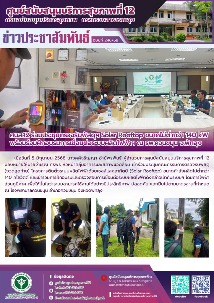 เมื่อวันที่ 5 มิถุนายน 2568 นางศศิจริญญา อำม์พรพันธ์ ผู้อำนวยการศูนย์สนับสนุนบริการสุขภาพที่ 12 มอบหมายให้นายจำเริญ ศิริพร หัวหน้ากลุ่มอาคารและสภาพแวดล้อม เข้าร่วมประชุมคณะกรรมการตรวจรับพัสดุ (งวดสุดท้าย) โครงการติดตั้งระบบผลิตไฟฟ้าด้วยเซลล์แสงอาทิตย์ (Solar Rooftop) ขนาดกำลังผลิตไม่ต่ำกว่า 140 กิโลวัตต์ และเข้าร่วมการฝึกอบรมและตรวจสอบการเชื่อมต่อระบบผลิตไฟฟ้าดังกล่าวเข้ากับระบบฯ โดยการไฟฟ้าส่วนภูมิภาค เพื่อให้มั่นใจว่าระบบสามารถใช้งานได้อย่างมีประสิทธิภาพ ปลอดภัย และเป็นไปตามมาตรฐานที่กำหนด ณ โรงพยาบาลควนขนุน อำเภอควนขนุน จังหวัดพัทลุง