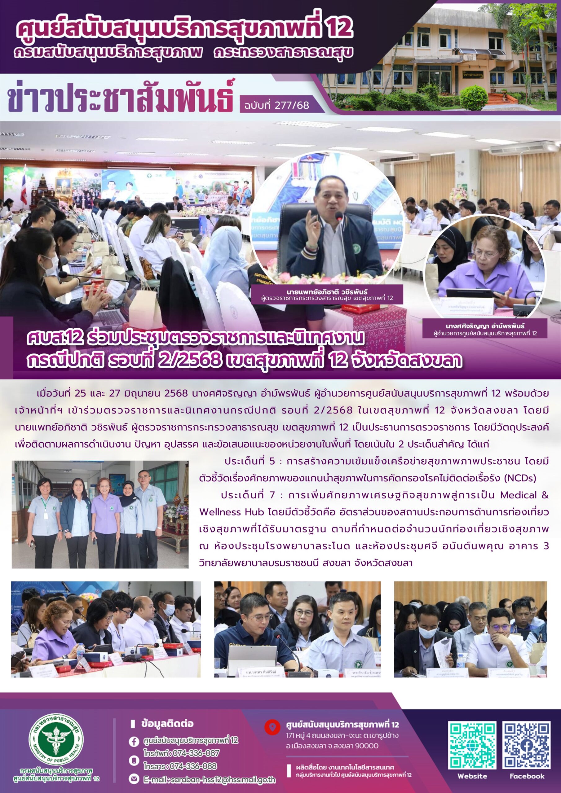 เมื่อวันที่ 25 และ 27 มิถุนายน 2568 นางศศิจริญญา อำม์พรพันธ์ ผู้อำนวยการศูนย์สนับสนุนบริการสุขภาพที่ 12 พร้อมด้วยเจ้าหน้าที่ฯ เข้าร่วมตรวจราชการและนิเทศงานกรณีปกติ รอบที่ 2/2568 ในเขตสุขภาพที่ 12 จังหวัดสงขลา โดยมี นายแพทย์อภิชาติ วชิรพันธ์ ผู้ตรวจราชการกระทรวงสาธารณสุข เขตสุขภาพที่ 12 เป็นประธานการตรวจราชการ โดยมีวัตถุประสงค์เพื่อติดตามผลการดำเนินงาน ปัญหา อุปสรรค และข้อเสนอแนะของหน่วยงานในพื้นที่ โดยเน้นใน 2 ประเด็นสำคัญ ได้แก่