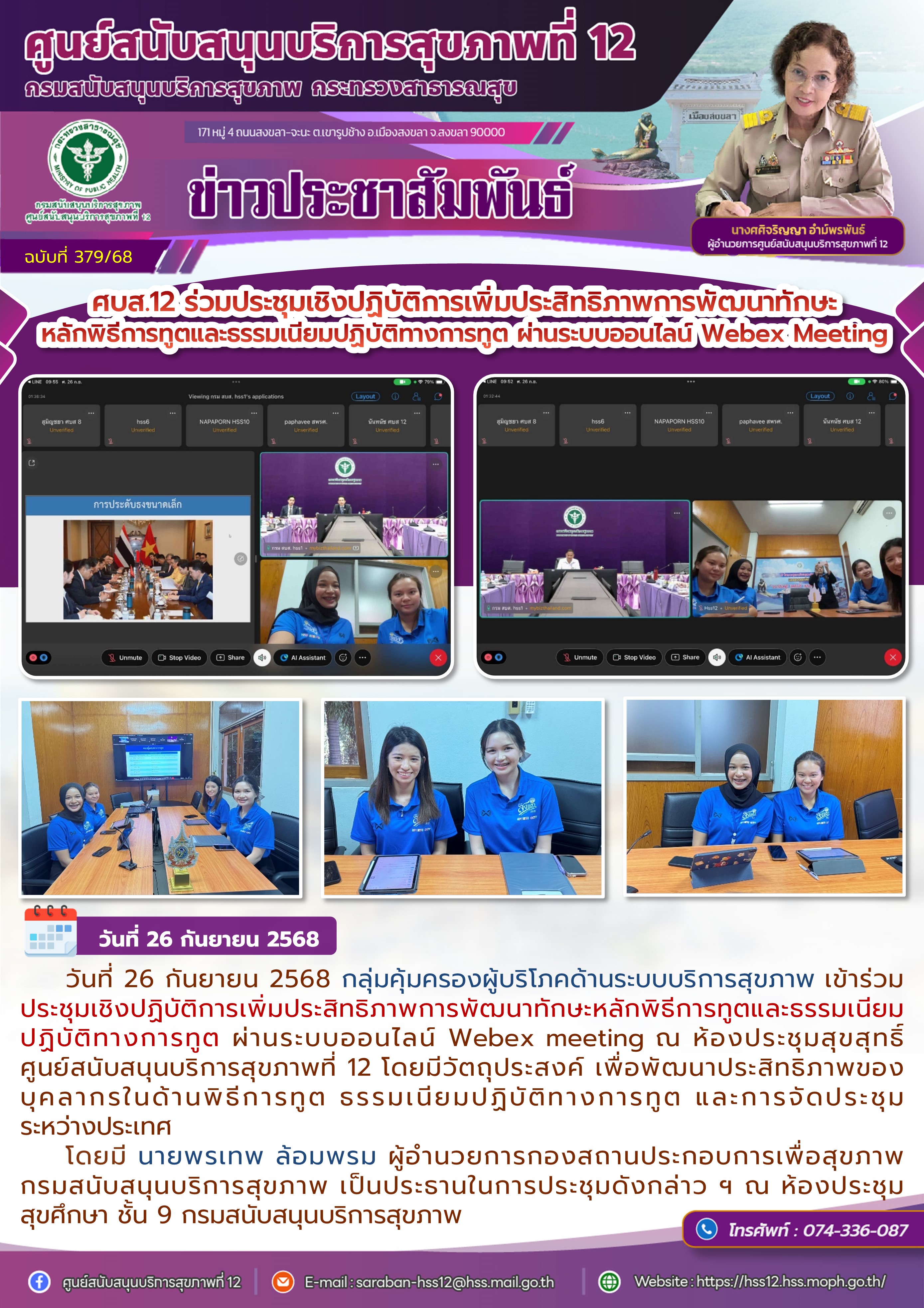 วันที่ 26 กันยายน 2568 กลุ่มคุ้มครองผู้บริโภคด้านระบบบริการสุขภาพ เข้าร่วมประชุมเชิงปฏิบัติการเพิ่มประสิทธิภาพการพัฒนาทักษะหลักพิธีการทูตและธรรมเนียมปฏิบัติทางการทูต ผ่านระบบออนไลน์ Webex meeting ณ ห้องประชุมสุขสุทธิ์ศูนย์สนับสนุนบริการสุขภาพที่ 12 โดยมีวัตถุประสงค์ เพื่อพัฒนาประสิทธิภาพของบุคลากรในด้านพิธีการทูต ธรรมเนียมปฏิบัติทางการทูต และการจัดประชุมระหว่างประเทศ