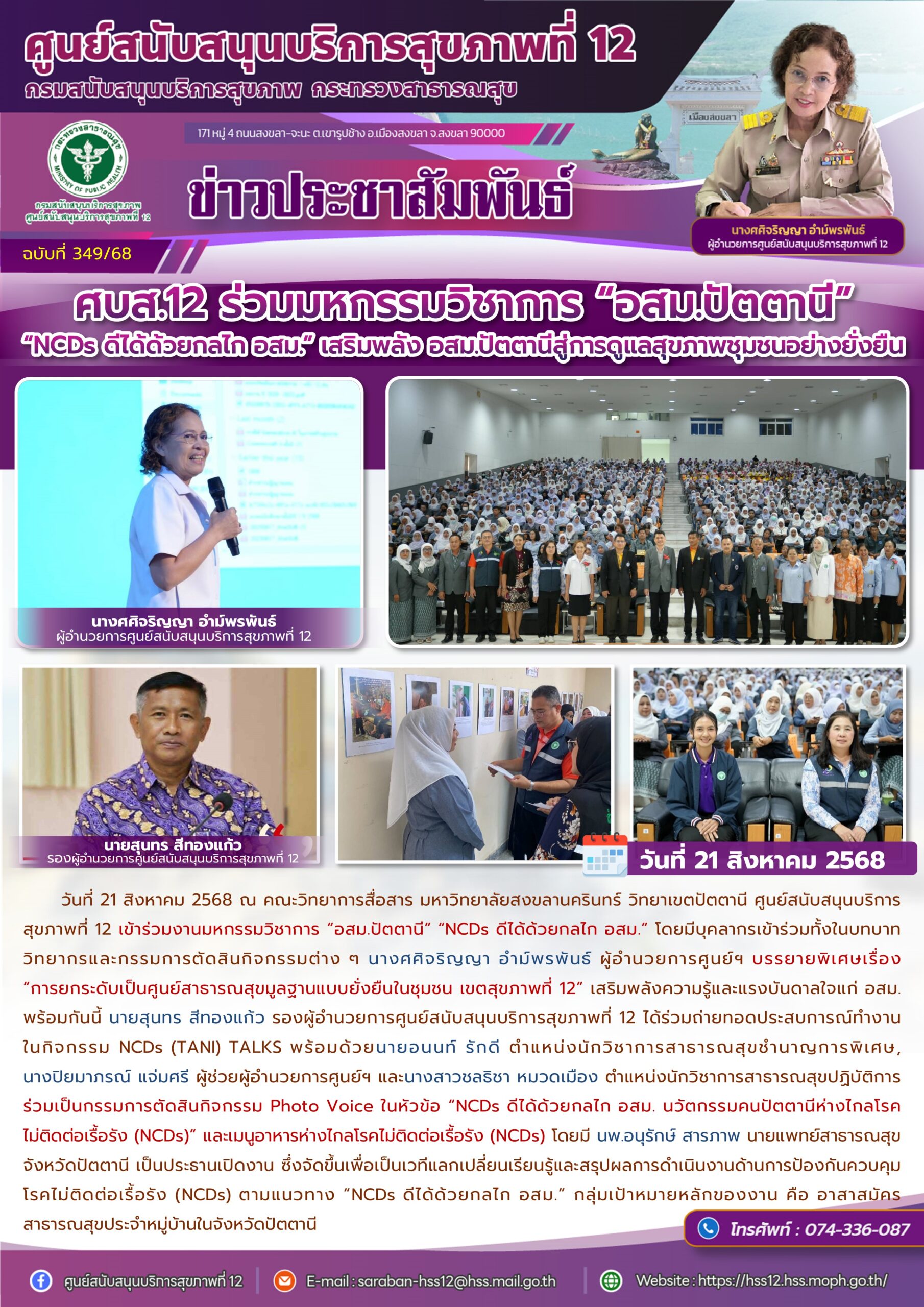 วันที่ 21 สิงหาคม 2568 ณ คณะวิทยาการสื่อสาร มหาวิทยาลัยสงขลานครินทร์ วิทยาเขตปัตตานี ศูนย์สนับสนุนบริการสุขภาพที่ 12 เข้าร่วมงานมหกรรมวิชาการ “อสม.ปัตตานี” “NCDs ดีได้ด้วยกลไก อสม.” โดยมีบุคลากรเข้าร่วมทั้งในบทบาทวิทยากรและกรรมการตัดสินกิจกรรมต่าง ๆ นางศศิจริญญา อำม์พรพันธ์ ผู้อำนวยการศูนย์ฯ บรรยายพิเศษเรื่อง “การยกระดับเป็นศูนย์สาธารณสุขมูลฐานแบบยั่งยืนในชุมชน เขตสุขภาพที่ 12” เสริมพลังความรู้และแรงบันดาลใจแก่ อสม. พร้อมกันนี้ นายสุนทร สีทองแก้ว รองผู้อำนวยการศูนย์สนับสนุนบริการสุขภาพที่ 12 ได้ร่วมถ่ายทอดประสบการณ์ทำงานในกิจกรรม NCDs (TANI) TALKS พร้อมด้วยนายอนนท์ รักดี ตำแหน่งนักวิชาการสาธารณสุขชำนาญการพิเศษ, นางปิยมาภรณ์ แจ่มศรี ผู้ช่วยผู้อำนวยการศูนย์ฯ และนางสาวชลธิชา หมวดเมือง ตำแหน่งนักวิชาการสาธารณสุขปฏิบัติการ ร่วมเป็นกรรมการตัดสินกิจกรรม Photo Voice ในหัวข้อ “NCDs ดีได้ด้วยกลไก อสม. นวัตกรรมคนปัตตานีห่างไกลโรคไม่ติดต่อเรื้อรัง (NCDs)” และเมนูอาหารห่างไกลโรคไม่ติดต่อเรื้อรัง (NCDs) โดยมี นพ.อนุรักษ์ สารภาพ นายแพทย์สาธารณสุขจังหวัดปัตตานี เป็นประธานเปิดงาน ซึ่งจัดขึ้นเพื่อเป็นเวทีแลกเปลี่ยนเรียนรู้และสรุปผลการดำเนินงานด้านการป้องกันควบคุมโรคไม่ติดต่อเรื้อรัง (NCDs) ตามแนวทาง “NCDs ดีได้ด้วยกลไก อสม.” กลุ่มเป้าหมายหลักของงาน คือ อาสาสมัครสาธารณสุขประจำหมู่บ้านในจังหวัดปัตตานี