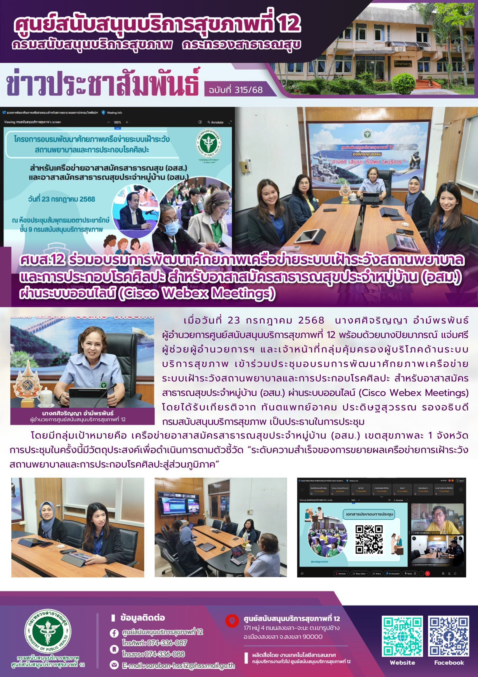 เมื่อวันที่ 23 กรกฎาคม 2568 นางศศิจริญญา อำม์พรพันธ์ ผู้อำนวยการศูนย์สนับสนุนบริการสุขภาพที่ 12 พร้อมด้วยนางปิยมาภรณ์ แจ่มศรี ผู้ช่วยผู้อำนวยการฯ และเจ้าหน้าที่กลุ่มคุ้มครองผู้บริโภคด้านระบบบริการสุขภาพ เข้าร่วมประชุมอบรมการพัฒนาศักยภาพเครือข่ายระบบเฝ้าระวังสถานพยาบาลและการประกอบโรคศิลปะ สำหรับอาสาสมัครสาธารณสุขประจำหมู่บ้าน (อสม.) ผ่านระบบออนไลน์ (Cisco Webex Meetings) โดยได้รับเกียรติจาก ทันตแพทย์อาคม ประดิษฐสุวรรณ รองอธิบดีกรมสนับสนุนบริการสุขภาพ เป็นประธานในการประชุม
