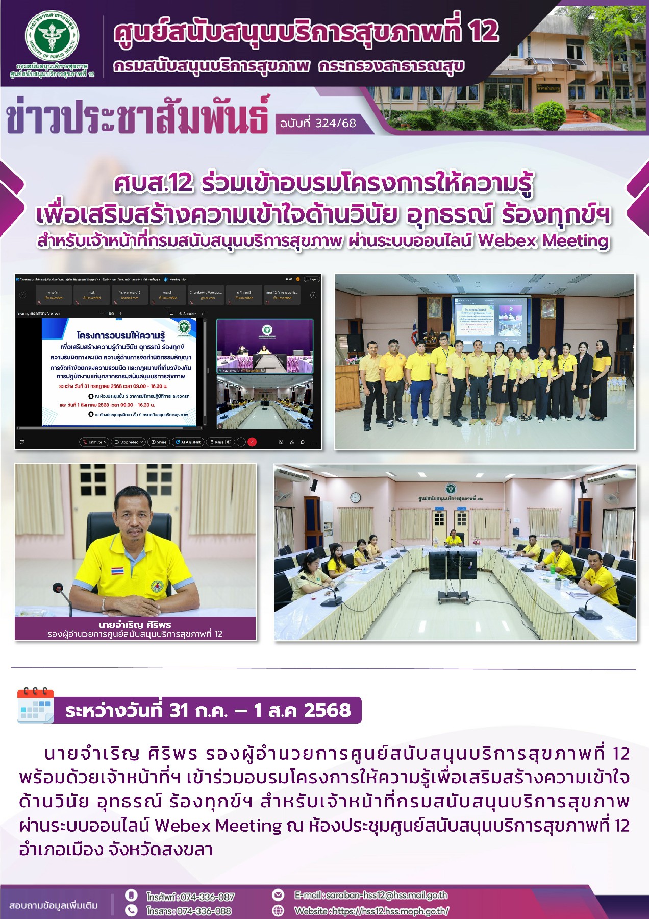 ระหว่างวันที่ 31 กรกฎาคม – 1 สิงหาคม 2568 นายจำเริญ ศิริพร รองผู้อำนวยการศูนย์สนับสนุนบริการสุขภาพที่ 12 พร้อมด้วยเจ้าหน้าที่ฯ เข้าร่วมอบรมโครงการให้ความรู้เพื่อเสริมสร้างความเข้าใจ ด้านวินัย อุทธรณ์ ร้องทุกข์ฯ สำหรับเจ้าหน้าที่กรมสนับสนุนบริการสุขภาพ ผ่านระบบออนไลน์ Webex Meeting ณ ห้องประชุมศูนย์สนับสนุนบริการสุขภาพที่ 12 อำเภอเมือง จังหวัดสงขลา