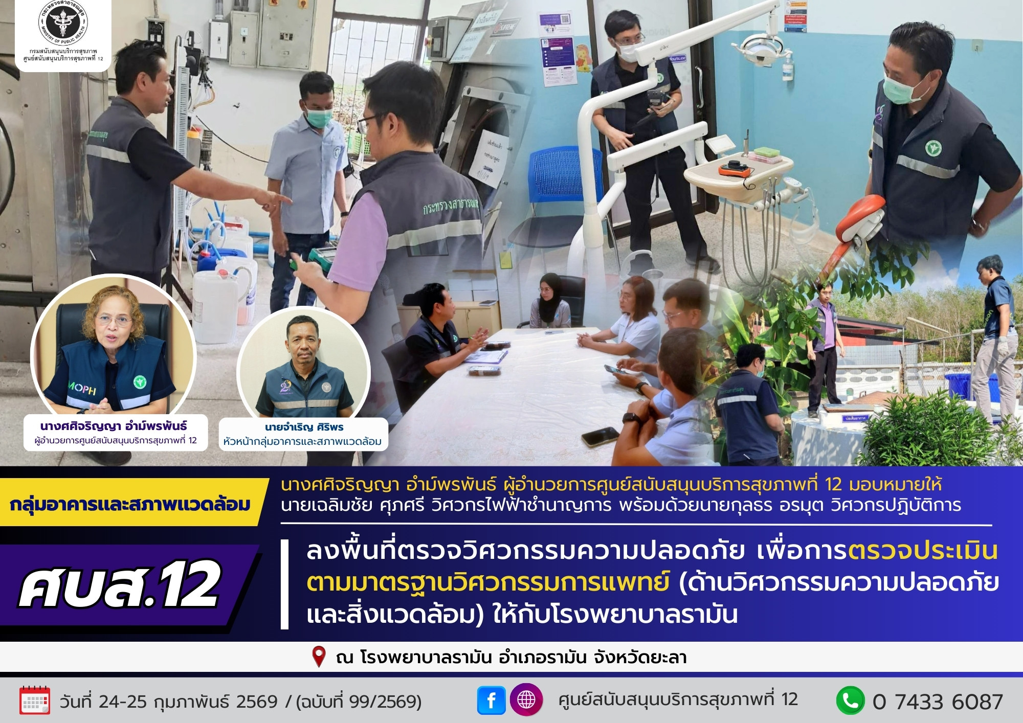 ระหว่างวันที่ 24-25 กุมภาพันธ์ 2569 นางศศิจริญญา อำม์พรพันธ์ ผู้อำนวยการศูนย์สนับสนุนบริการสุขภาพที่ 12 มอบหมายให้นายเฉลิมชัย ศุภศรี วิศวกรไฟฟ้าชำนาญการ พร้อมด้วยนายกุลธร อรมุต วิศวกรปฏิบัติการ ลงพื้นที่ตรวจวิศวกรรมความปลอดภัย เพื่อการตรวจประเมินตามมาตรฐานวิศวกรรมการแพทย์ (ด้านวิศวกรรมความปลอดภัยและสิ่งแวดล้อม) ให้กับโรงพยาบาลรามัน อำเภอรามัน จังหวัดยะลา
