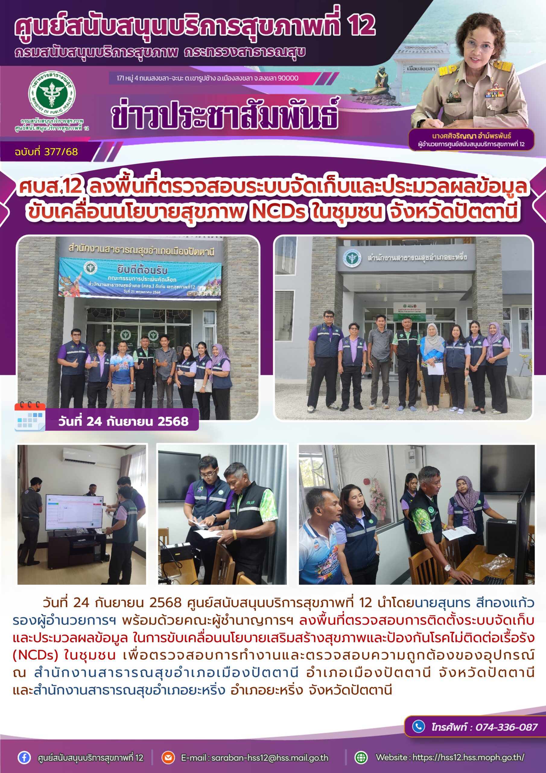 ศบส.12 ลงพื้นที่ตรวจสอบระบบจัดเก็บและประมวลผลข้อมูล ขับเคลื่อนนโยบายสุขภาพ NCDs ในชุมชน จังหวัดปัตตานี
