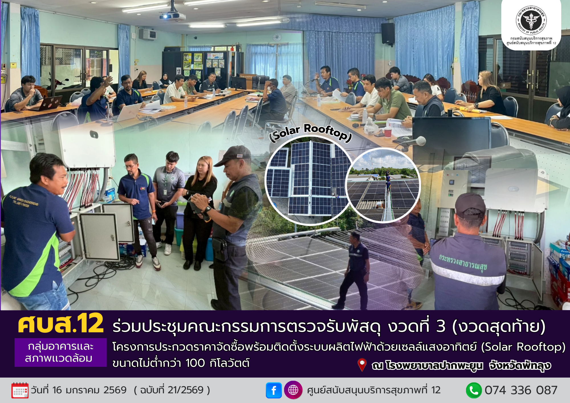 วันที่ 16 มกราคม 2569 ศูนย์สนับสนุนบริการสุขภาพที่ 12 โดย นายจำเริญ ศิริพร หัวหน้ากลุ่มอาคารและสภาพแวดล้อม เข้าร่วมประชุมคณะกรรมการตรวจรับพัสดุ งวดที่ 3 (งวดสุดท้าย) โครงการประกวดราคาจัดซื้อพร้อมติดตั้งระบบผลิตไฟฟ้าด้วยเซลล์แสงอาทิตย์ (Solar Rooftop) ขนาดไม่ต่ำกว่า 100 กิโลวัตต์ พร้อมทั้งดำเนินการทดสอบระบบฯ ดังกล่าว เพื่อให้มั่นใจว่าการติดตั้งเป็นไปตามมาตรฐาน สามารถผลิตไฟฟ้าได้ อย่างมีประสิทธิภาพและปลอดภัย ณ โรงพยาบาลปากพะยูน จังหวัดพัทลุง