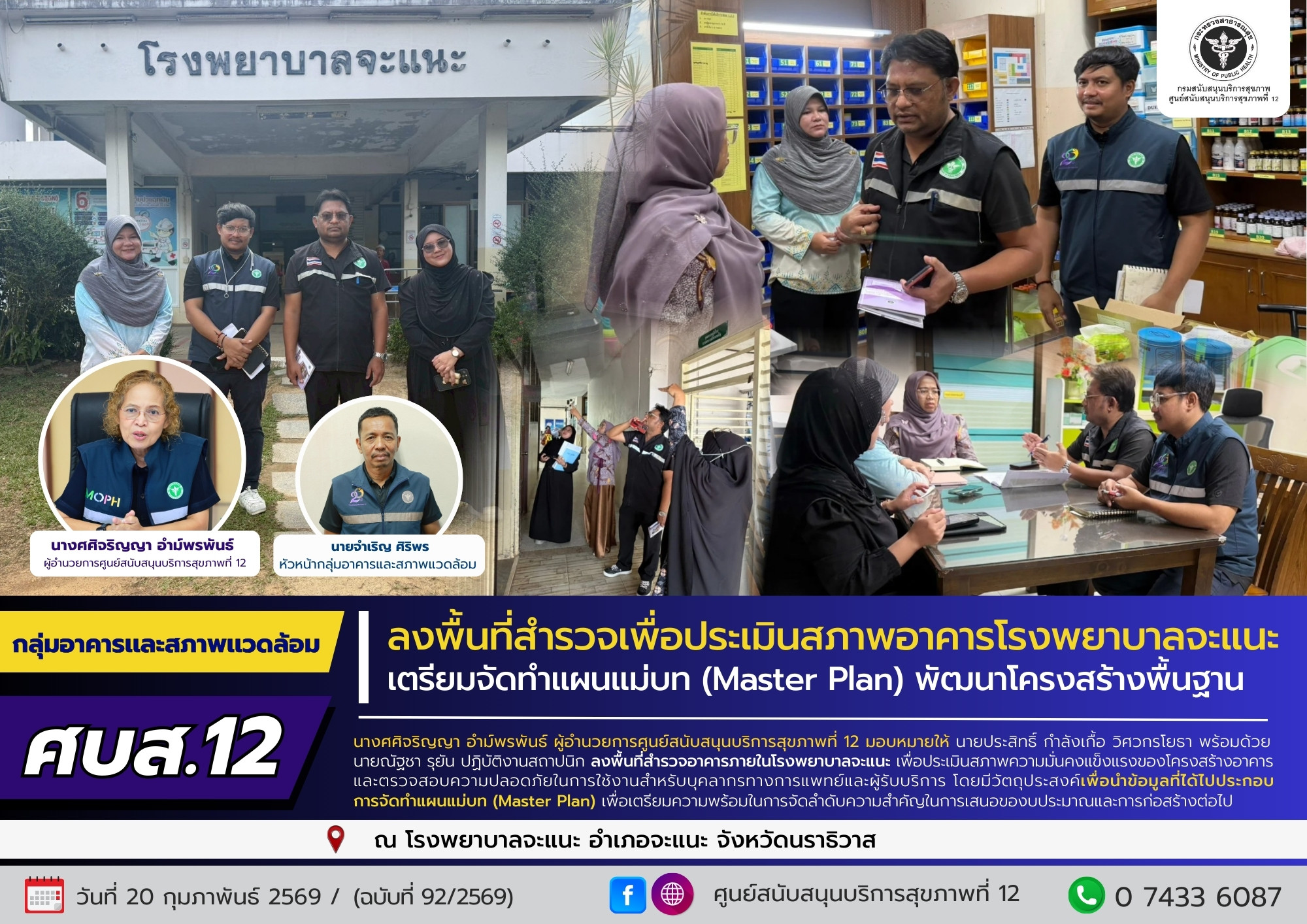 วันที่ 20 กุมภาพันธ์ 2569 นางศศิจริญญา อำม์พรพันธ์ ผู้อำนวยการศูนย์สนับสนุนบริการสุขภาพที่ 12 มอบหมายให้ นายประสิทธิ์ กำลังเกื้อ วิศวกรโยธา พร้อมด้วยนายณัฐชา รุยัน ปฏิบัติงานสถาปนิก ลงพื้นที่สำรวจอาคารภายในโรงพยาบาลจะแนะ เพื่อประเมินสภาพความมั่นคงแข็งแรงของโครงสร้างอาคาร และตรวจสอบความปลอดภัยในการใช้งานสำหรับบุคลากรทางการแพทย์และผู้รับบริการ โดยมีวัตถุประสงค์เพื่อนำข้อมูลที่ได้ไปประกอบการจัดทำแผนแม่บท (Master Plan) เพื่อเตรียมความพร้อมในการจัดลำดับความสำคัญในการเสนอของบประมาณและการก่อสร้างต่อไป ณ โรงพยาบาลจะแนะ อำเภอจะแนะ จังหวัดนราธิวาส