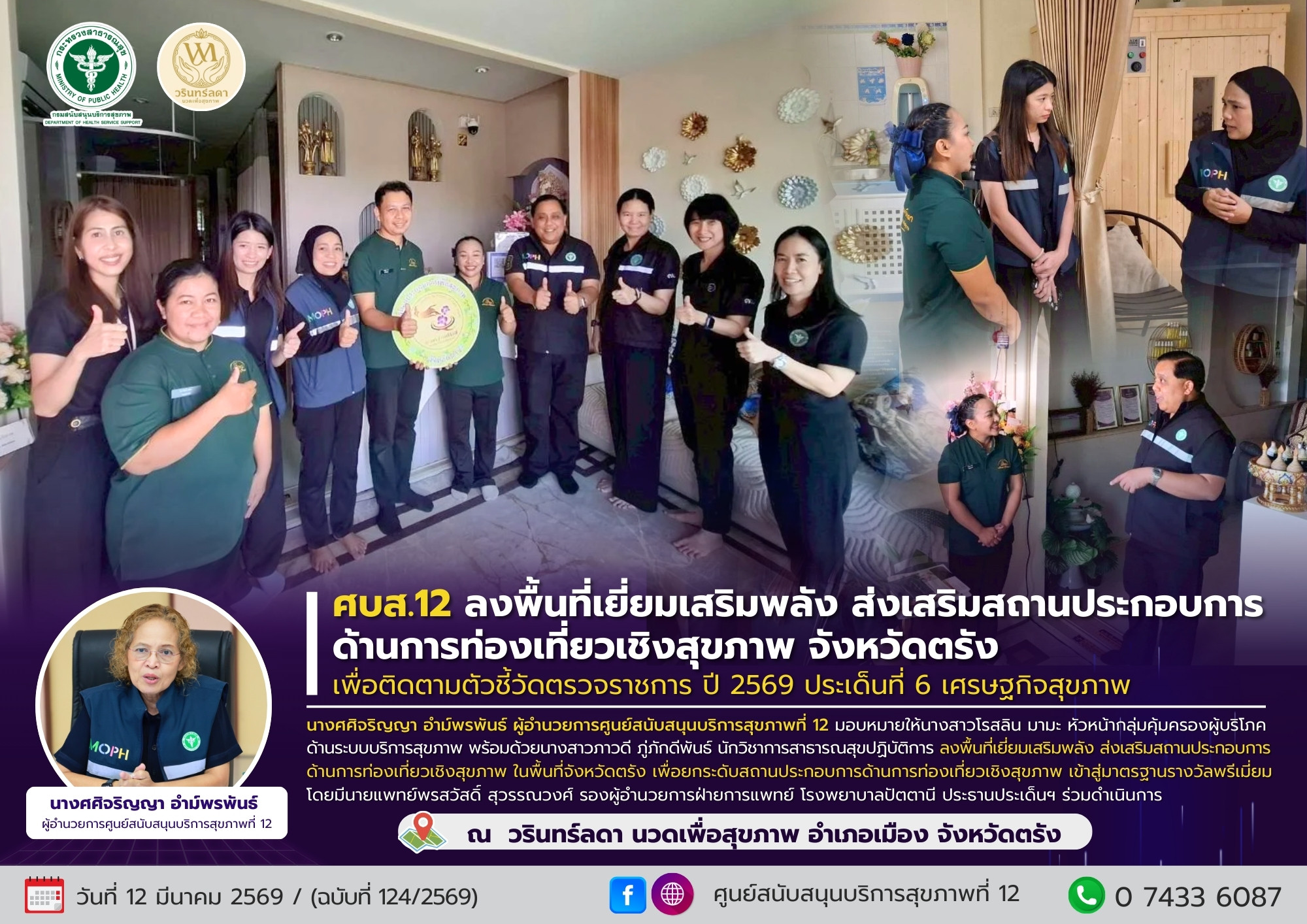 วันที่ 12 มีนาคม 2569 นางศศิจริญญา อำม์พรพันธ์ ผู้อำนวยการศูนย์สนับสนุนบริการสุขภาพที่ 12 มอบหมายให้นางสาวโรสลิน มามะ หัวหน้ากลุ่มคุ้มครองผู้บริโภคด้านระบบบริการสุขภาพ พร้อมด้วยนางสาวภาวดี ภู่ภักดีพันธ์ นักวิชาการสาธารณสุขปฏิบัติการ ลงพื้นที่เยี่ยมเสริมพลัง ส่งเสริมสถานประกอบการด้านการท่องเที่ยวเชิงสุขภาพ ในพื้นที่จังหวัดตรัง ตามตัวชี้วัดตรวจราชการ ปี 2569 ประเด็นที่ 6 เศรษฐกิจสุขภาพ เพื่อยกระดับสถานประกอบการด้านการท่องเที่ยวเชิงสุขภาพ เข้าสู่มาตรฐานรางวัลพรีเมี่ยม โดยมีนายแพทย์พรสวัสดิ์ สุวรรณวงศ์ รองผู้อำนวยการฝ่ายการแพทย์ โรงพยาบาลปัตตานี ประธานประเด็นฯ ร่วมดำเนินการ ณ วรินทร์ลดา นวดเพื่อสุขภาพ อำเภอเมือง จังหวัดตรัง