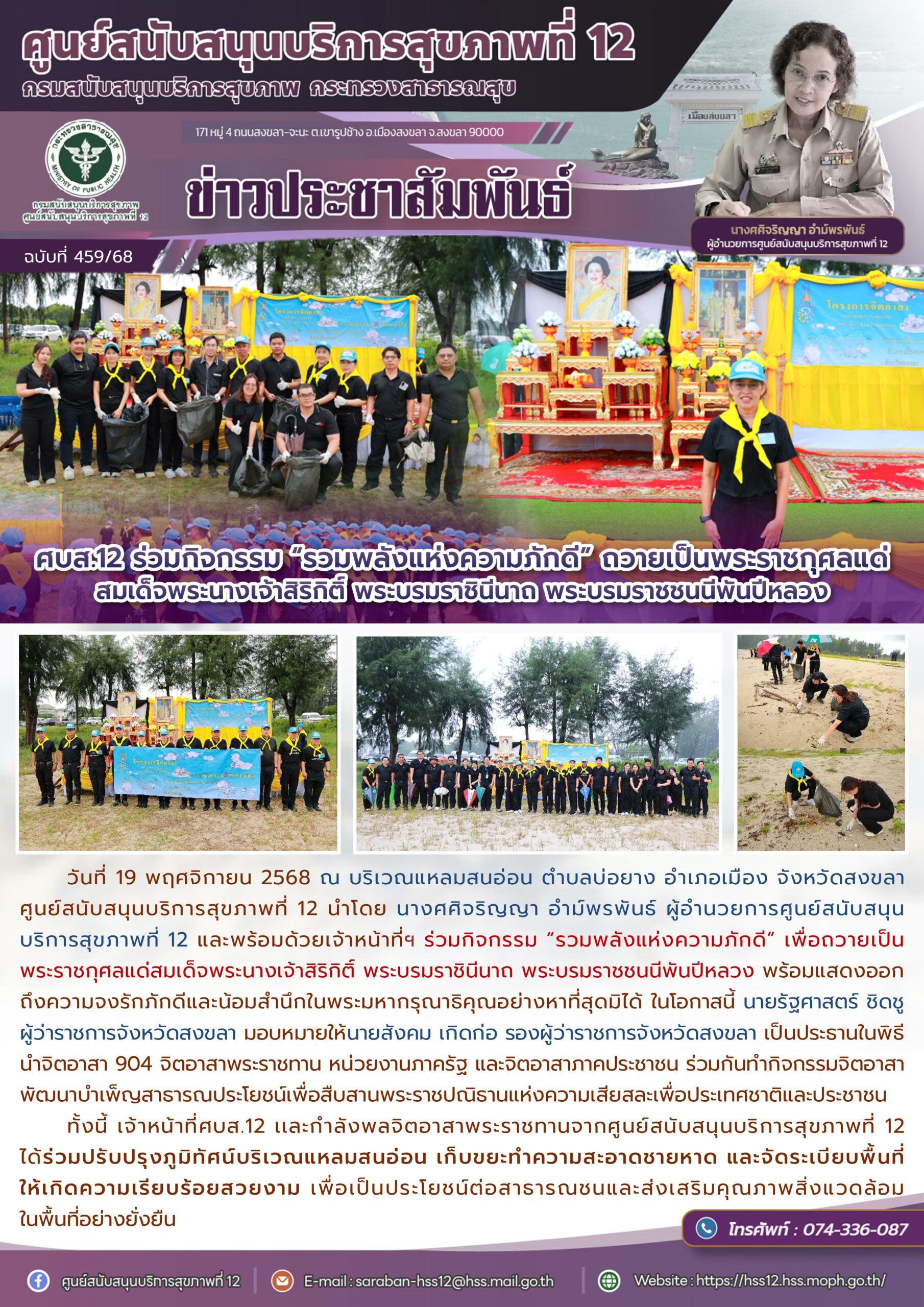 วันที่ 19 พฤศจิกายน 2568 ณ บริเวณแหลมสนอ่อน ตำบลบ่อยาง อำเภอเมือง จังหวัดสงขลา ศูนย์สนับสนุนบริการสุขภาพที่ 12 นำโดย นางศศิจริญญา อำม์พรพันธ์ ผู้อำนวยการศูนย์สนับสนุน บริการสุขภาพที่ 12 และพร้อมด้วยเจ้าหน้าที่ฯ ร่วมกิจกรรม “รวมพลังแห่งความภักดี” เพื่อถวายเป็นพระราชกุศลแด่สมเด็จพระนางเจ้าสิริกิติ์ พระบรมราชินีนาถ พระบรมราชชนนีพันปีหลวง พร้อมแสดงออกถึงความจงรักภักดีและน้อมสำนึกในพระมหากรุณาธิคุณอย่างหาที่สุดมิได้ ในโอกาสนี้ นายรัฐศาสตร์ ชิดชู ผู้ว่าราชการจังหวัดสงขลา มอบหมายให้นายสังคม เกิดก่อ รองผู้ว่าราชการจังหวัดสงขลา เป็นประธานในพิธี นำจิตอาสา 904 จิตอาสาพระราชทาน หน่วยงานภาครัฐ และจิตอาสาภาคประชาชน ร่วมกันทำกิจกรรมจิตอาสาพัฒนาบำเพ็ญสาธารณประโยชน์เพื่อสืบสานพระราชปณิธานแห่งความเสียสละเพื่อประเทศชาติและประชาชน