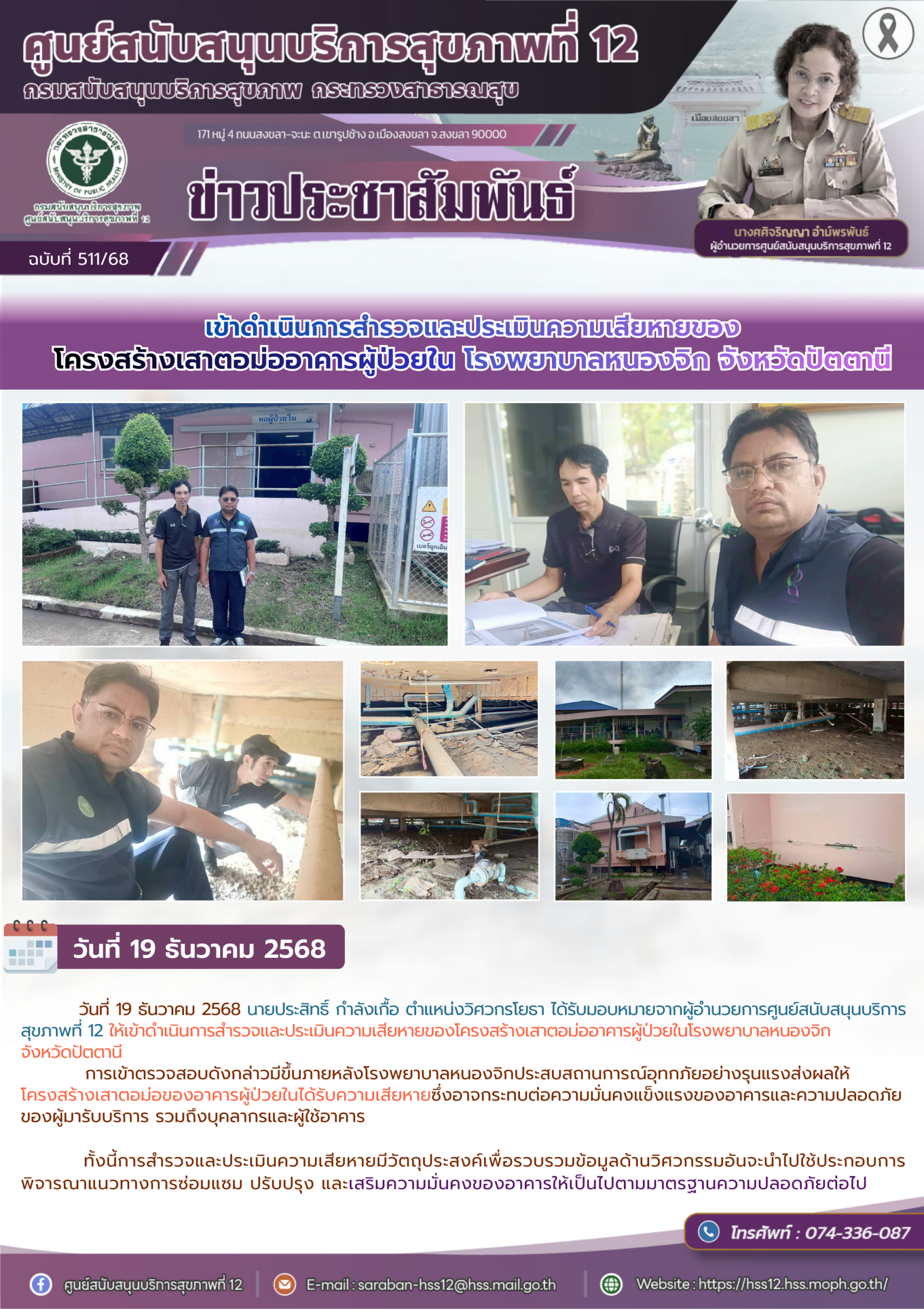 วันที่ 19 ธันวาคม 2568 นายประสิทธิ์ กำลังเกื้อ ตำแหน่งวิศวกรโยธา ได้รับมอบหมายจากผู้อำนวยการศูนย์สนับสนุนบริการสุขภาพที่ 12 ให้เข้าดำเนินการสำรวจและประเมินความเสียหายของโครงสร้างเสาตอม่ออาคารผู้ป่วยในโรงพยาบาลหนองจิกจังหวัดปัตตานี
