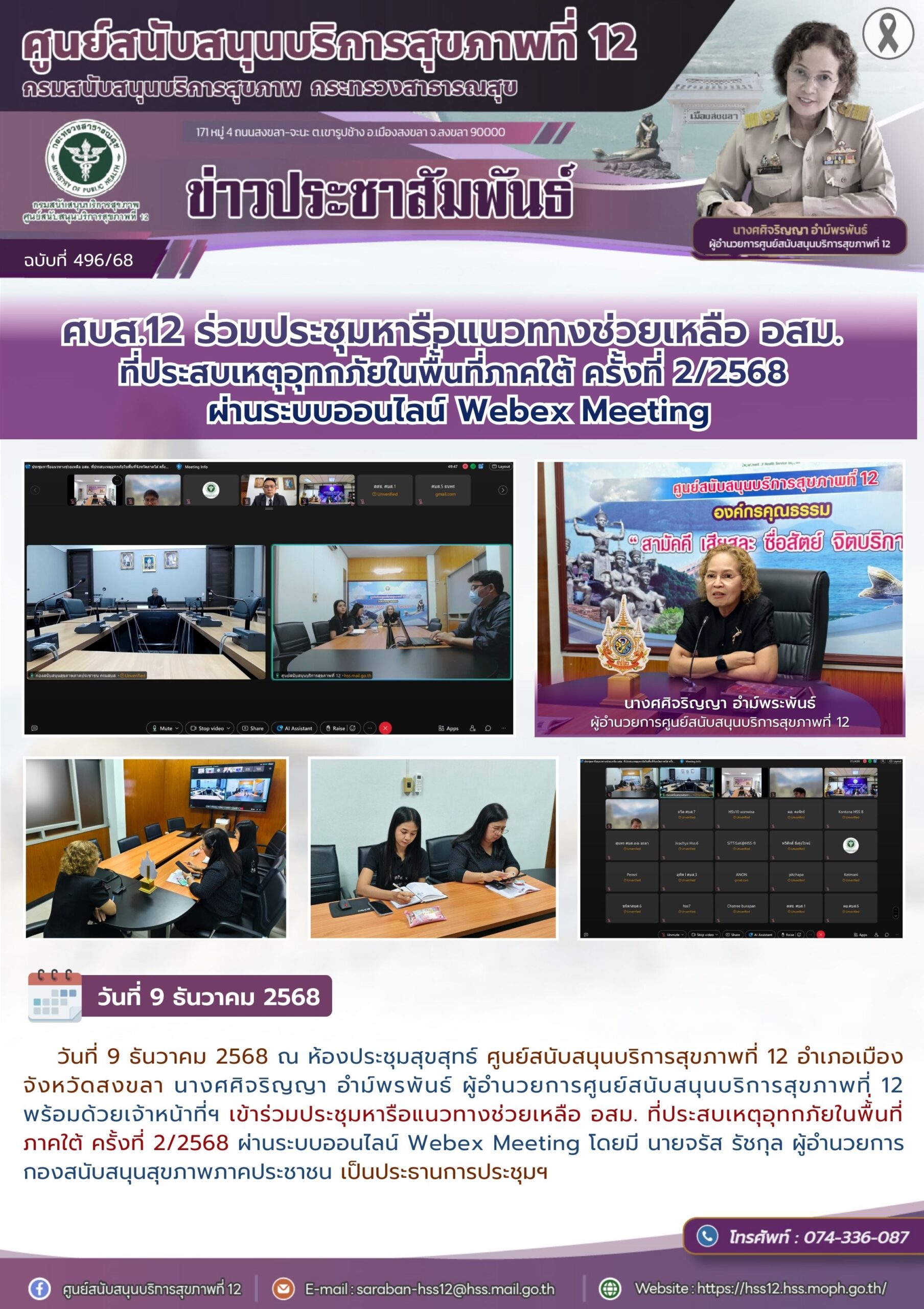 วันที่ 9 ธันวาคม 2568 ณ ห้องประชุมสุขสุทธ์ ศูนย์สนับสนุนบริการสุขภาพที่ 12 อำเภอเมือง จังหวัดสงขลา นางศศิจริญญา อำม์พรพันธ์ ผู้อำนวยการศูนย์สนับสนุนบริการสุขภาพที่ 12 พร้อมด้วยเจ้าหน้าที่ฯ เข้าร่วมประชุมหารือแนวทางช่วยเหลือ อสม. ที่ประสบเหตุอุทกภัยในพื้่นที่ ภาคใต้ ครั้งที่ 2/2568 ผ่านระบบออนไลน์ Webex Meeting โดยมี นายจรัส รัชกุล ผู้อำนวยการ กองสนับสนุนสุขภาพภาคประชาชน เป็นประธานการประชุมฯ