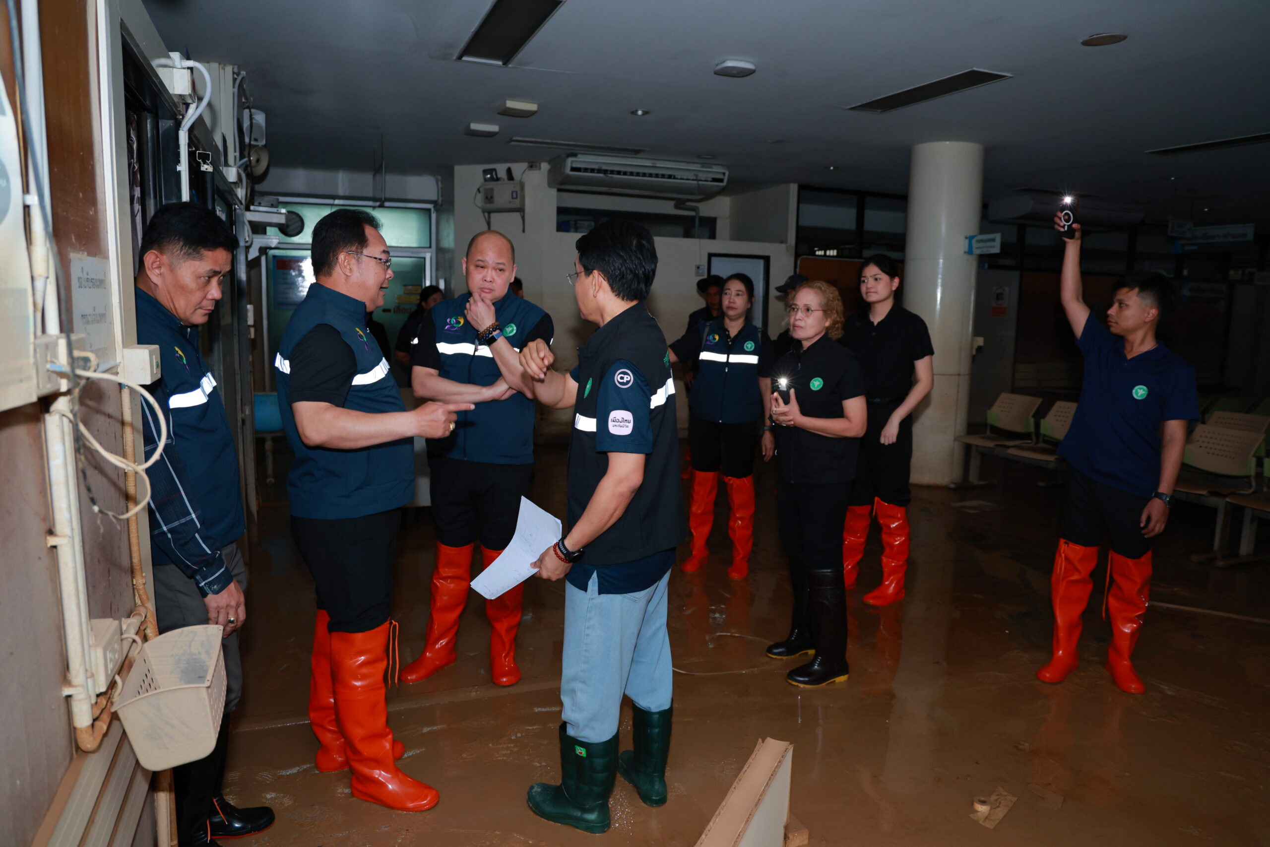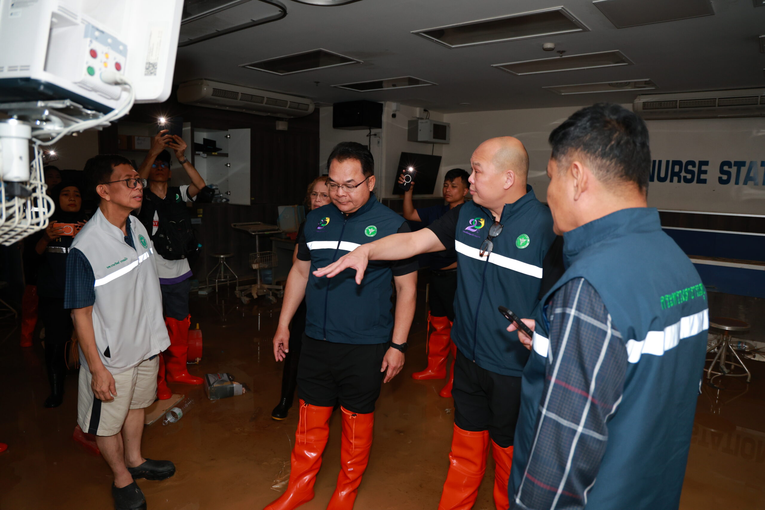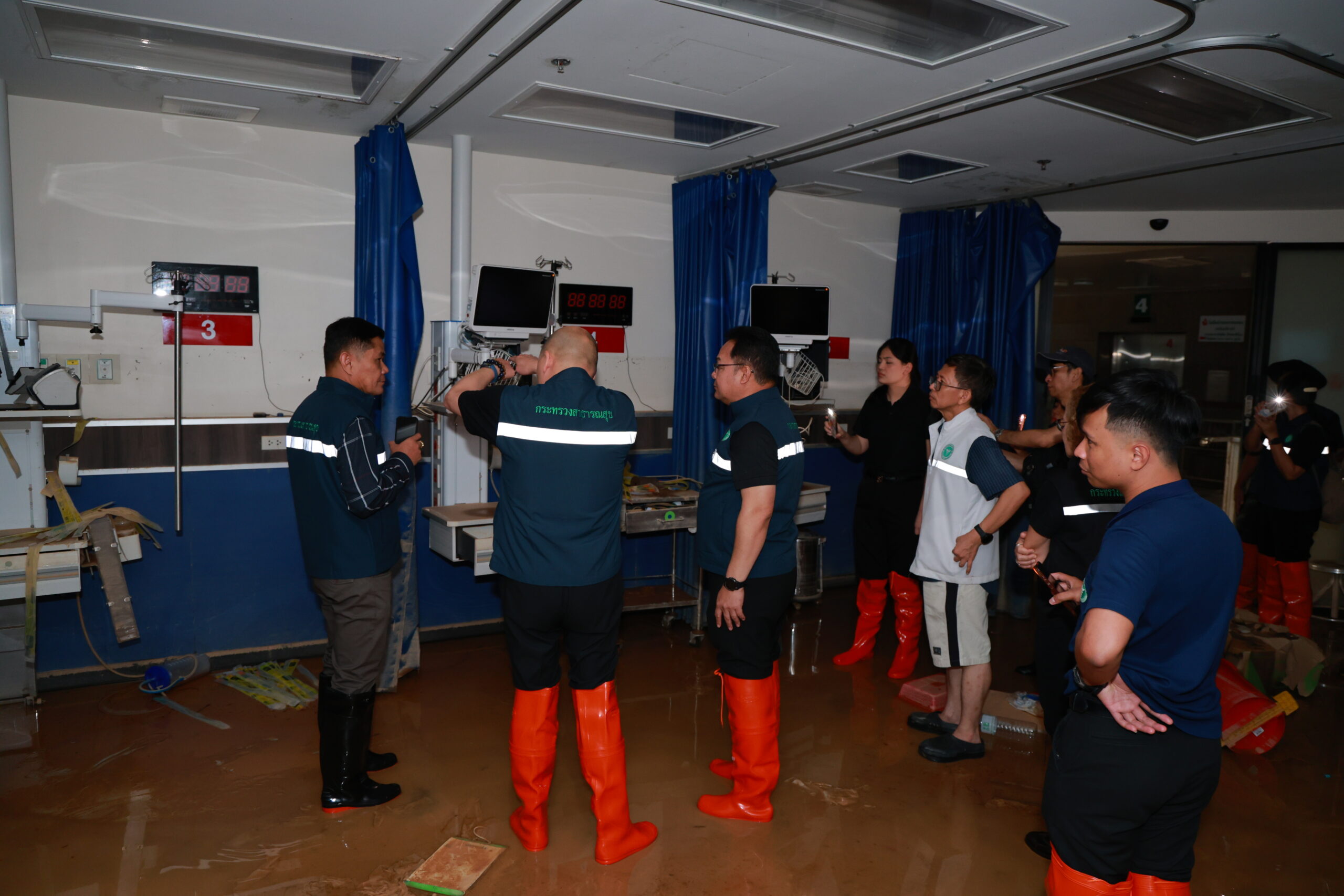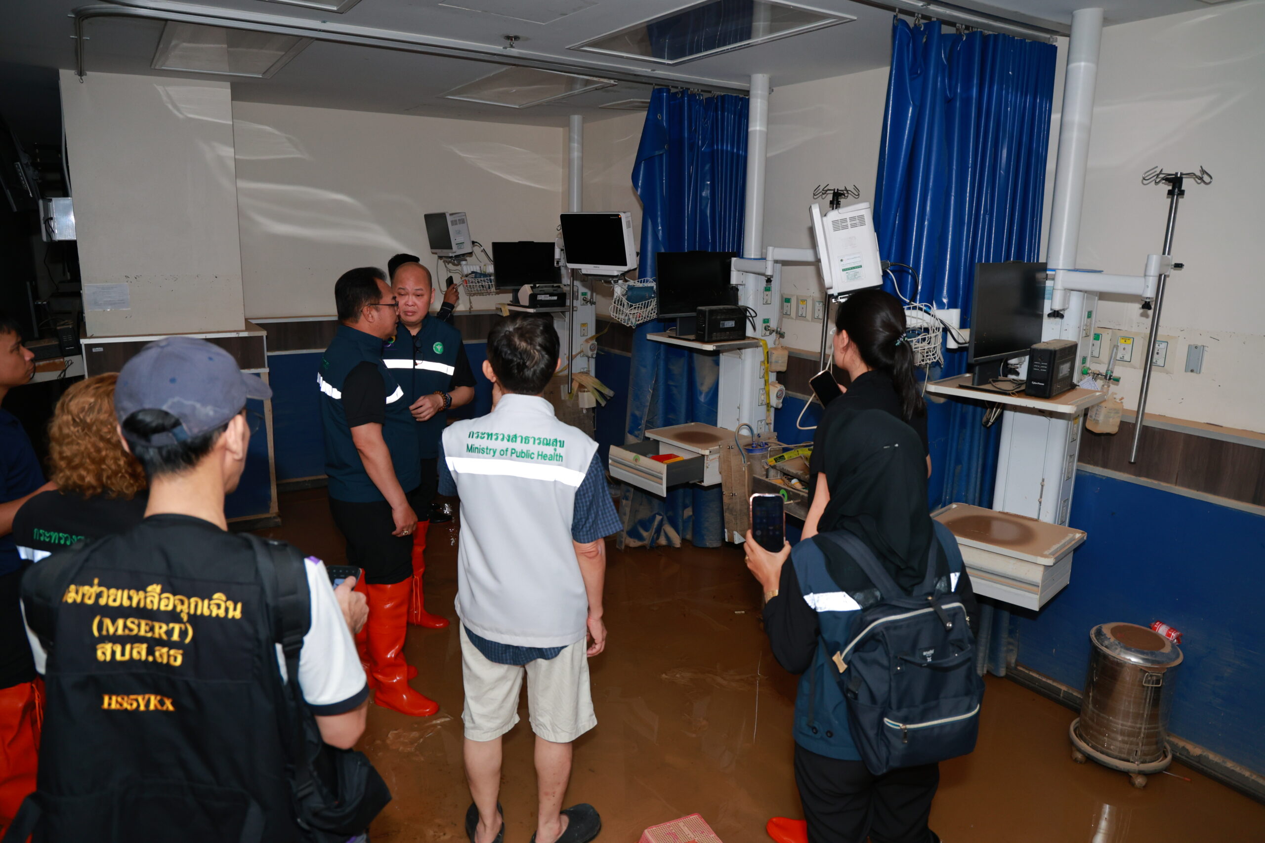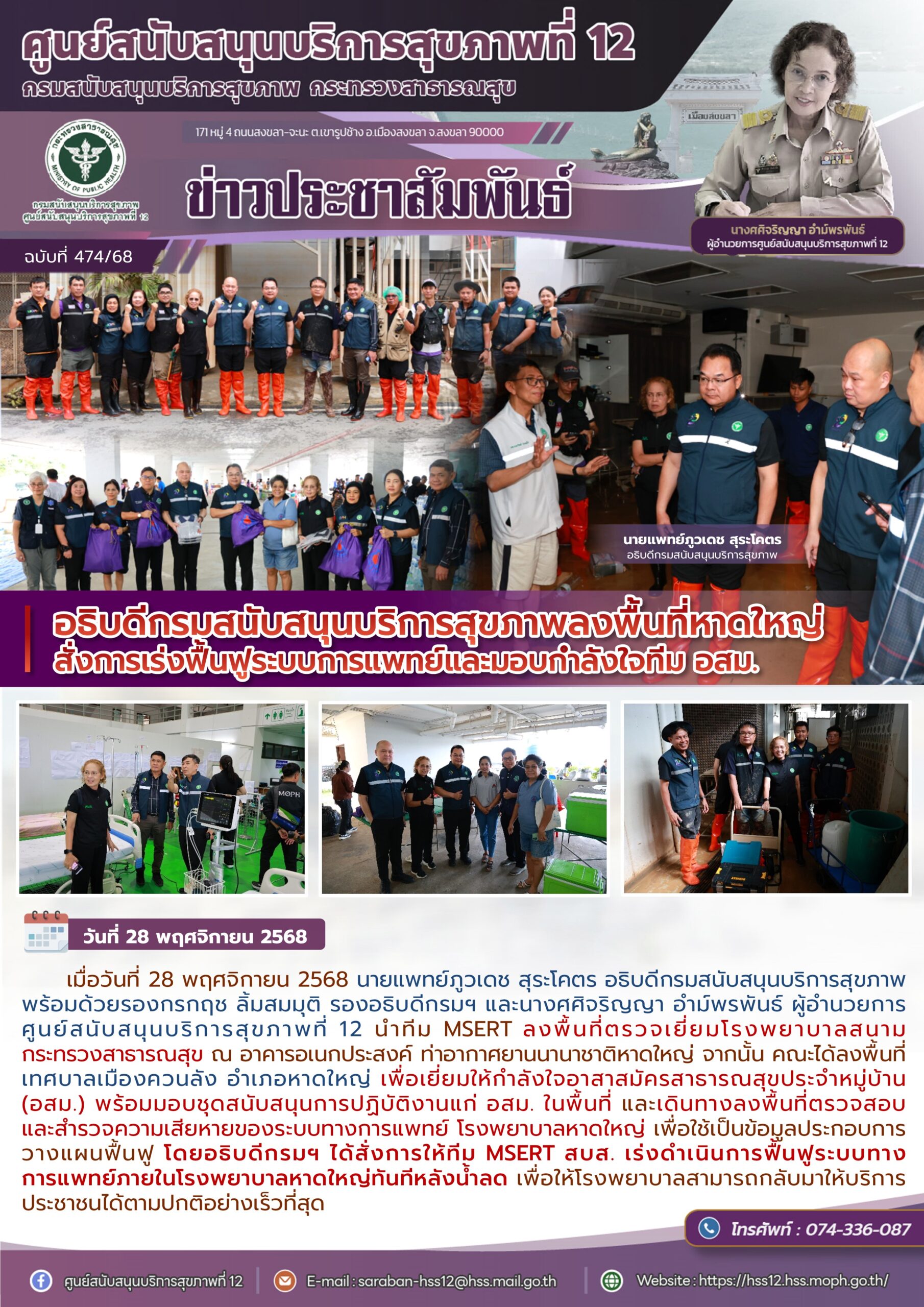 เมื่อวันที่ 28 พฤศจิกายน 2568 นายแพทย์ภูวเดช สุระโคตร อธิบดีกรมสนับสนุนบริการสุขภาพ พร้อมด้วยรองกรกฤช ลิ้มสมมุติ รองอธิบดีกรมฯ และนางศศิจริญญา อำม์พรพันธ์ ผู้อำนวยการศูนย์สนับสนุนบริการสุขภาพที่ 12 นำทีม MSERT ลงพื้นที่ตรวจเยี่ยมโรงพยาบาลสนาม กระทรวงสาธารณสุข ณ อาคารอเนกประสงค์ ท่าอากาศยานนานาชาติหาดใหญ่ จากนั้น คณะได้ลงพื้นที่เทศบาลเมืองควนลัง อำเภอหาดใหญ่ เพื่อเยี่ยมให้กำลังใจอาสาสมัครสาธารณสุขประจำหมู่บ้าน (อสม.) พร้อมมอบชุดสนับสนุนการปฏิบัติงานแก่ อสม. ในพื้นที่ และเดินทางลงพื้นที่ตรวจสอบและสำรวจความเสียหายของระบบทางการแพทย์ โรงพยาบาลหาดใหญ่ เพื่อใช้เป็นข้อมูลประกอบการวางแผนฟื้นฟู โดยอธิบดีกรมฯ ได้สั่งการให้ทีม MSERT สบส. เร่งดำเนินการฟื้นฟูระบบทางการแพทย์ภายในโรงพยาบาลหาดใหญ่ทันทีหลังน้ำลด เพื่อให้โรงพยาบาลสามารถกลับมาให้บริการประชาชนได้ตามปกติอย่างเร็วที่สุด