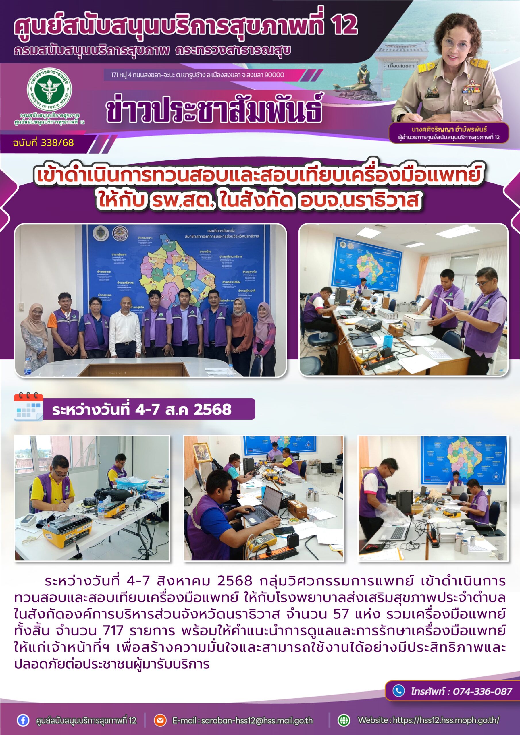 ระหว่างวันที่ 4-7 สิงหาคม 2568 กลุ่มวิศวกรรมการแพทย์ เข้าดำเนินการทวนสอบและสอบเทียบเครื่องมือแพทย์ ให้กับโรงพยาบาลส่งเสริมสุขภาพประจำตำบลในสังกัดองค์การบริหารส่วนจังหวัดนราธิวาส จำนวน 57 แห่ง รวมเครื่องมือแพทย์ทั้งสิ้น จำนวน 717 รายการ พร้อมให้คำแนะนำการดูแลและการรักษาเครื่องมือแพทย์ให้แก่เจ้าหน้าที่ฯ เพื่อสร้างความมั่นใจและสามารถใช้งานได้อย่างมีประสิทธิภาพและปลอดภัยต่อประชาชนผู้มารับบริการ