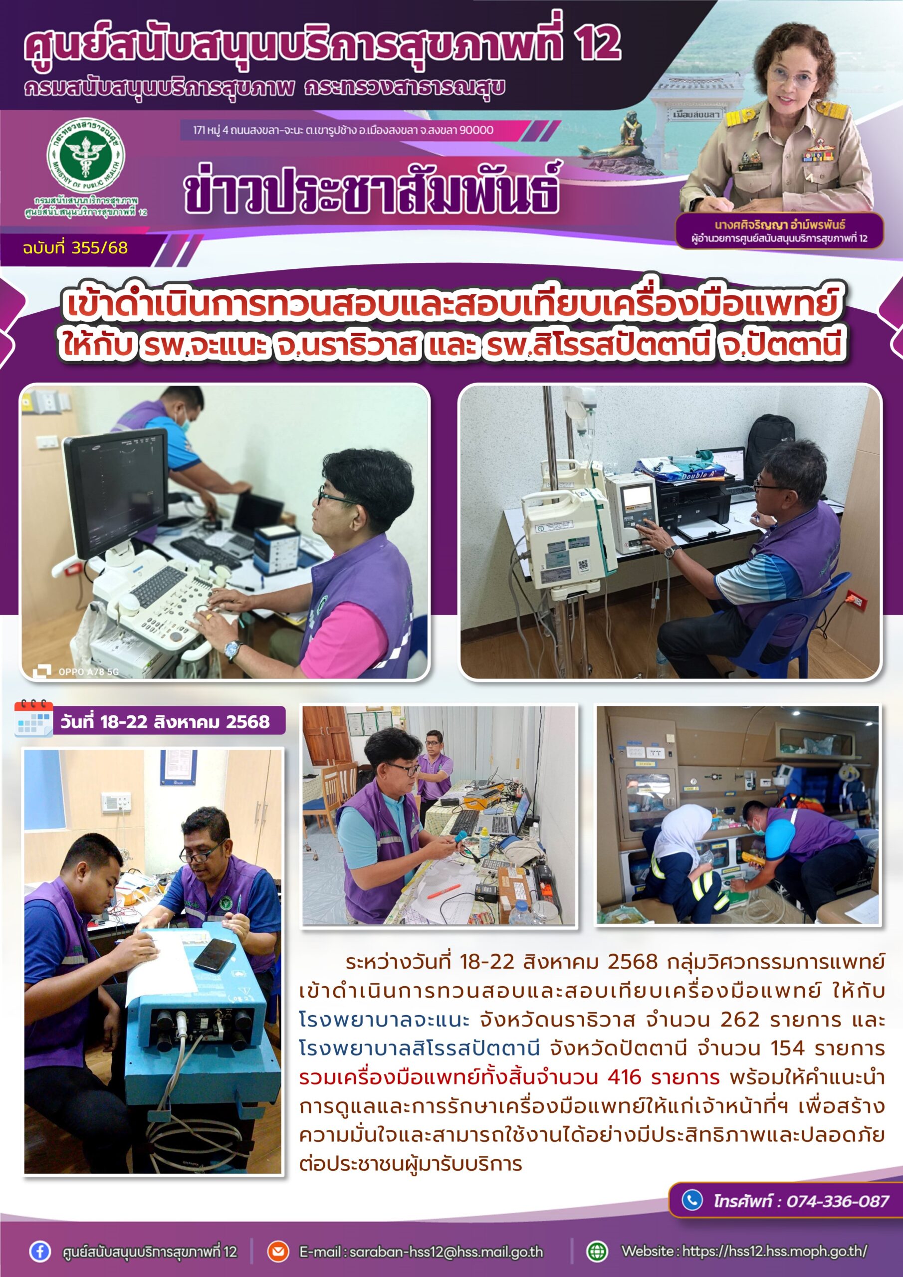 ระหว่างวันที่ 18-22 สิงหาคม 2568 กลุ่มวิศวกรรมการแพทย์ เข้าดำเนินการทวนสอบและสอบเทียบเครื่องมือแพทย์ ให้กับโรงพยาบาลจะแนะ จังหวัดนราธิวาส จำนวน 262 รายการ และโรงพยาบาลสิโรรสปัตตานี จังหวัดปัตตานี จำนวน 154 รายการ รวมเครื่องมือแพทย์ทั้งสิ้นจำนวน 416 รายการ พร้อมให้คำแนะนำการดูแลและการรักษาเครื่องมือแพทย์ให้แก่เจ้าหน้าที่ฯ เพื่อสร้างความมั่นใจและสามารถใช้งานได้อย่างมีประสิทธิภาพและปลอดภัยต่อประชาชนผู้มารับบริการ