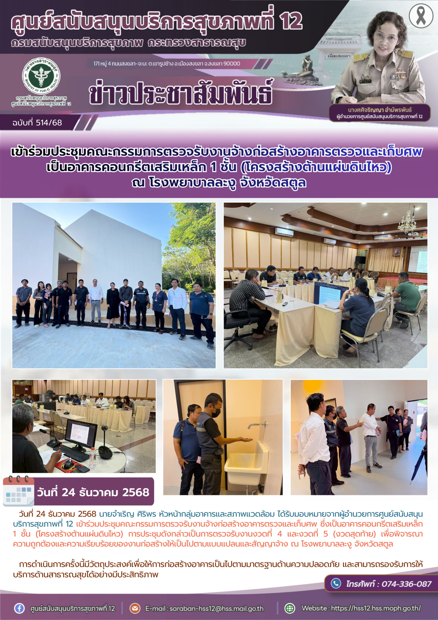 วันที่ 24 ธันวาคม 2568 นายจำเริญ ศิริพร หัวหน้ากลุ่มอาคารและสภาพแวดล้อม ได้รับมอบหมายจากผู้อำนวยการศูนย์สนับสนุนบริการสุขภาพที่ 12 เข้าร่วมประชุมคณะกรรมการตรวจรับงานจ้างก่อสร้างอาคารตรวจและเก็บศพ ซึ่งเป็นอาคารคอนกรีตเสริมเหล็ก 1 ชั้น (โครงสร้างต้านแผ่นดินไหว) การประชุมดังกล่าวเป็นการตรวจรับงานงวดที่ 4 และงวดที่ 5 (งวดสุดท้าย) เพื่อพิจารณา ความถูกต้องและความเรียบร้อยของงานก่อสร้างให้เป็นไปตามแบบแปลนและสัญญาจ้าง ณ โรงพยาบาลละงู จังหวัดสตูล การดำเนินการครั้งนี้มีวัตถุประสงค์เพื่อให้การก่อสร้างอาคารเป็นไปตามมาตรฐานด้านความปลอดภัย และสามารถรองรับการให้บริการด้านสาธารณสุขได้อย่างมีประสิทธิภาพ