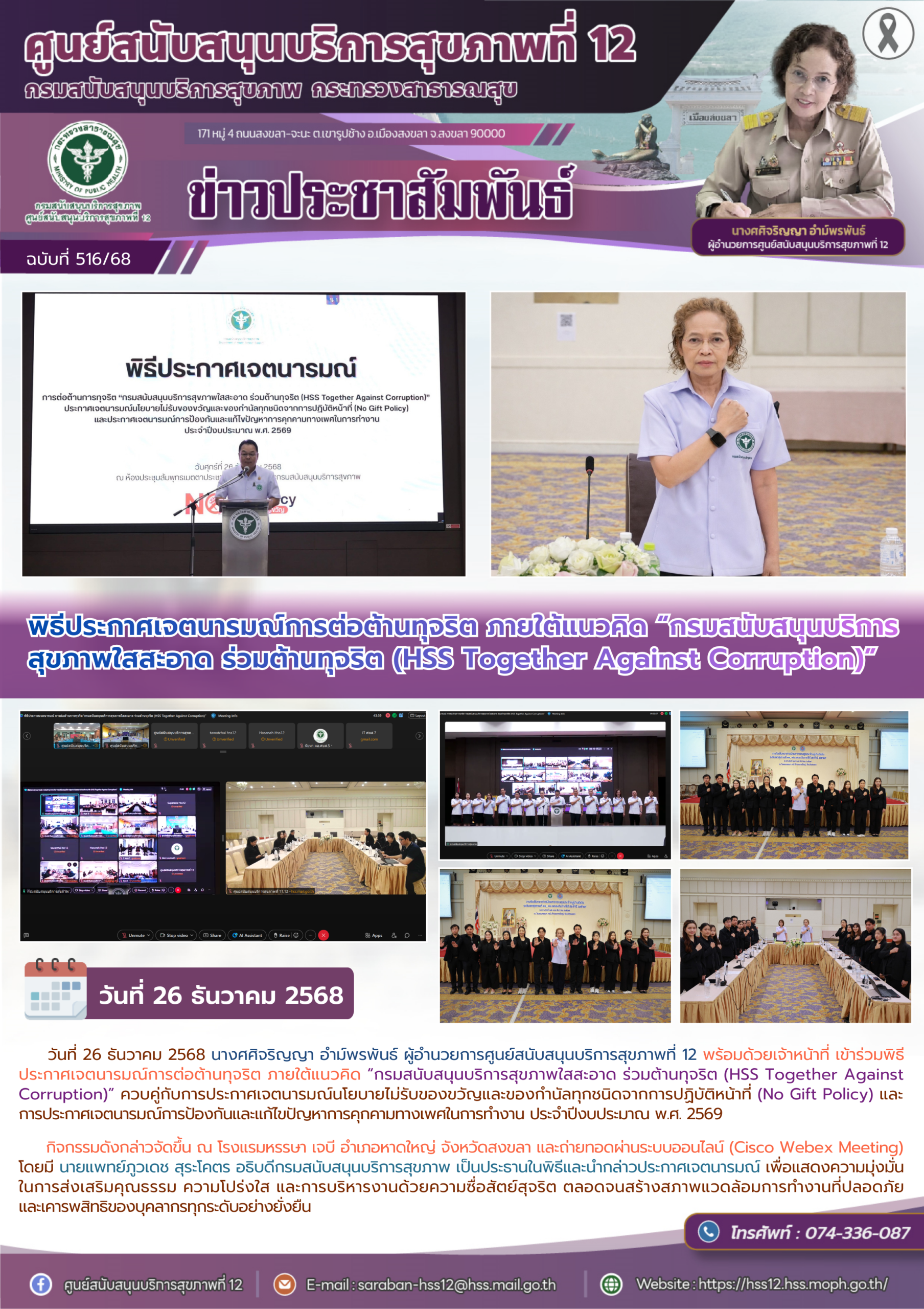 วันที่ 26 ธันวาคม 2568 นางศศิจริญญา อำม์พรพันธ์ ผู้อำนวยการศูนย์สนับสนุนบริการสุขภาพที่ 12 พร้อมด้วยเจ้าหน้าที่ เข้าร่วมพิธีประกาศเจตนารมณ์การต่อต้านทุจริต ภายใต้แนวคิด “กรมสนับสนุนบริการสุขภาพใสสะอาด ร่วมต้านทุจริต (HSS Together Against Corruption)” ควบคู่กับการประกาศเจตนารมณ์นโยบายไม่รับของขวัญและของกำนัลทุกชนิดจากการปฏิบัติหน้าที่ (No Gift Policy) และการประกาศเจตนารมณ์การป้องกันและแก้ไขปัญหาการคุกคามทางเพศในการทำงาน ประจำปีงบประมาณ พ.ศ.2569