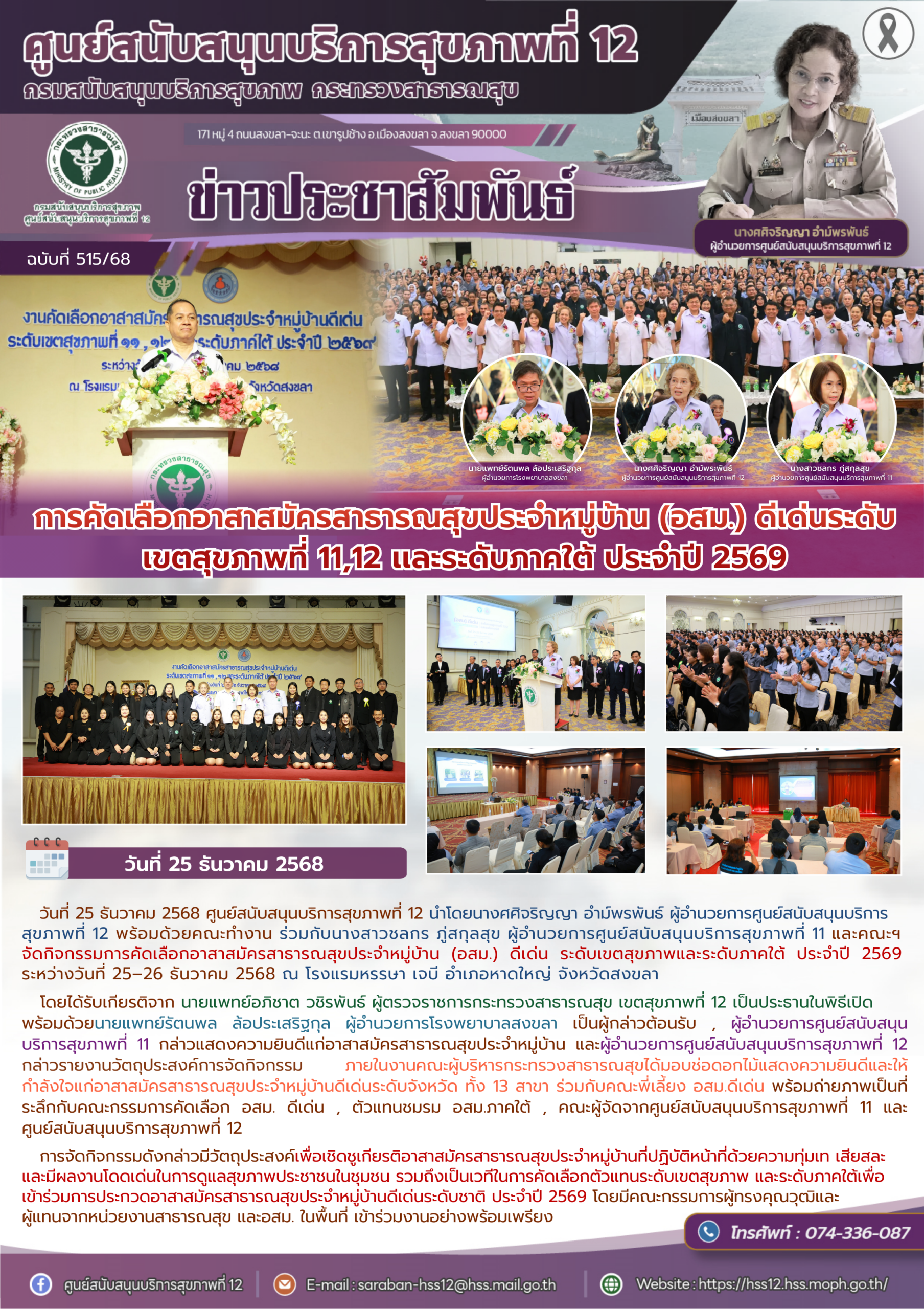 วันที่ 25ธันวาคม 2568 ศูนย์สนับสนุนบริการสุขภาพที่ 12 นำโดยนางศศิจริญญา อำม์พรพันธ์ ผู้อำนวยการศูนย์สนับสนุนบริการสุขภาพที่ 12 พร้อมด้วยคณะทำงาน ร่วมกับนางสาวชลกร ภู่สกุลสุข ผู้อำนวยการศูนย์สนับสนุนบริการสุขภาพที่ 11 และคณะฯจัดกิจกรรมการคัดเลือกอาสาสมัครสาธารณสุขประจำหมู่บ้าน (อสม.) ดีเด่น ระดับเขตสุขภาพและระดับภาคใต้ ประจำปี 2569 ระหว่างวันที่ 25–26 ธันวาคม 2568 ณ โรงแรมหรรษา เจบี อำเภอหาดใหญ่ จังหวัดสงขลา
