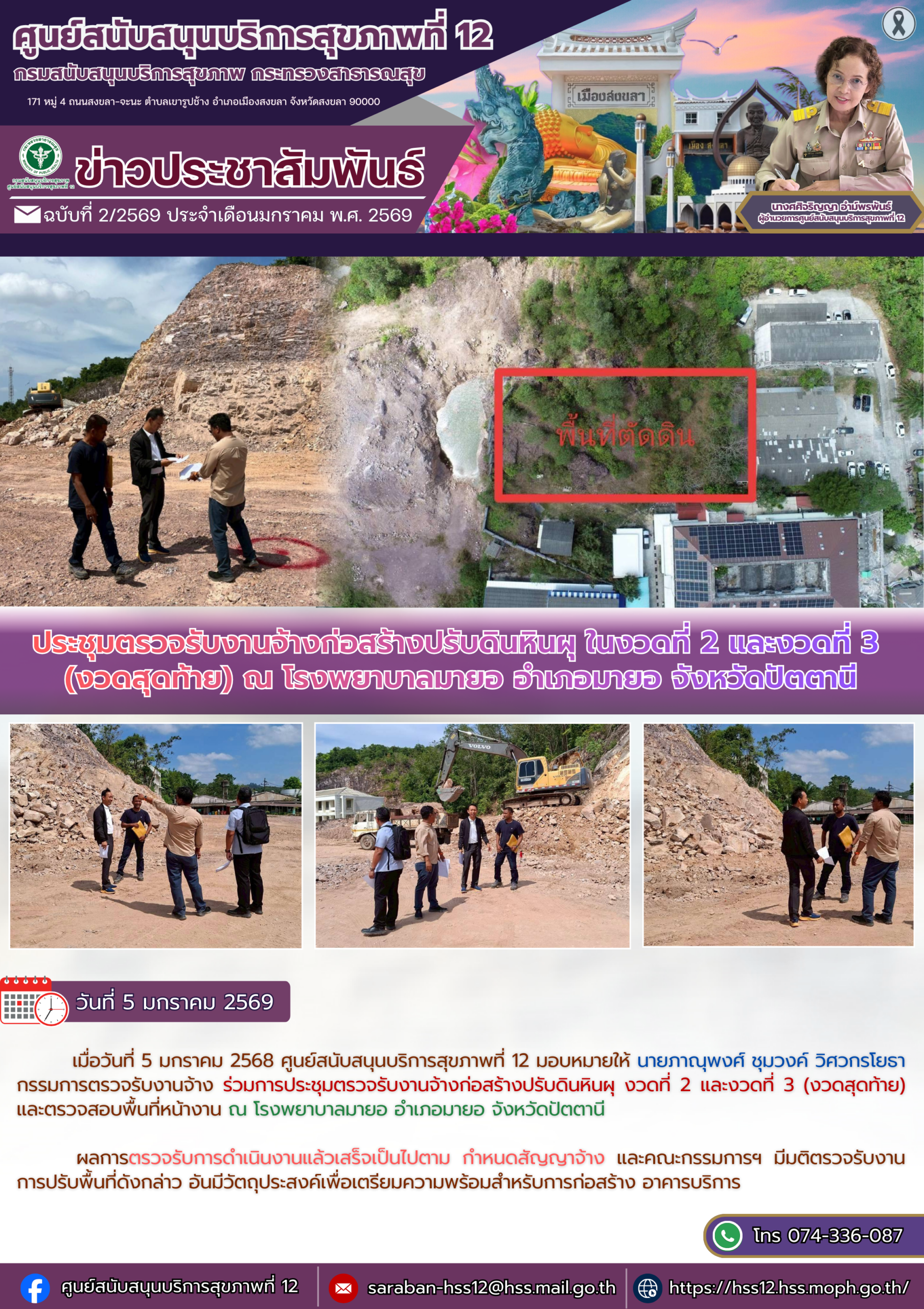 เมื่อวันที่ 5 มกราคม 2568 ศูนย์สนับสนุนบริการสุขภาพที่ 12 มอบหมายให้ นายภาณุพงศ์ ชุมวงค์ วิศวกรโยธา กรรมการตรวจรับงานจ้าง ร่วมการประชุมตรวจรับงานจ้างก่อสร้างปรับดินหินผุ งวดที่ 2 และงวดที่ 3 (งวดสุดท้าย) และตรวจสอบพื้นที่หน้างาน ณ โรงพยาบาลมายอ อำเภอมายอ จังหวัดปัตตานี