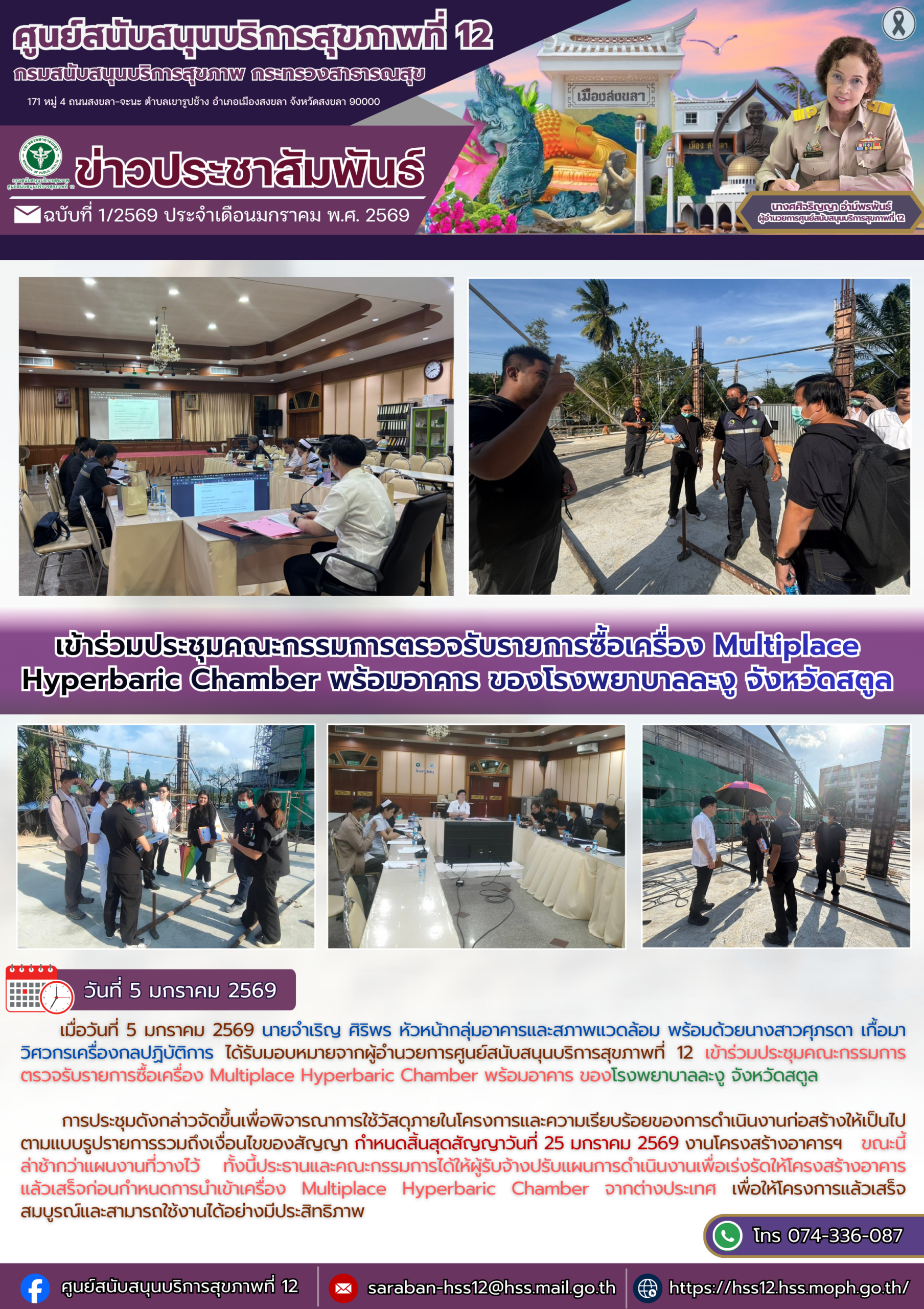 เมื่อวันที่ 5 มกราคม 2569 นายจำเริญ ศิริพร หัวหน้ากลุ่มอาคารและสภาพแวดล้อม พร้อมด้วยนางสาวศุภรดา เกื้อมา วิศวกรเครื่องกลปฏิบัติการ ได้รับมอบหมายจากผู้อำนวยการศูนย์สนับสนุนบริการสุขภาพที่ 12 เข้าร่วมประชุมคณะกรรมการตรวจรับรายการซื้อเครื่อง Multiplace Hyperbaric Chamber พร้อมอาคาร ของโรงพยาบาลละงู จังหวัดสตูล
